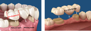 A dental bridge consists of Crowns, which fit (with special adhesives), over your reshaped adjacent natural teeth on either side of the space, artificial teeth – fill the missing space, restoring the smile.